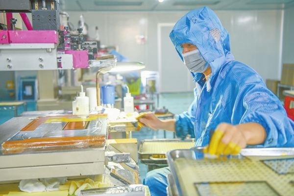 6月30日,道县高新技术产业开发区湖南玄烨科技有限公司,工人在生产光电显示屏。时近年中,当地企业开足马力,赶订单忙生产,力争完成“双过半”。