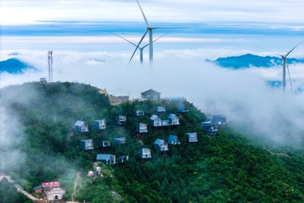在海拔818.8米的双峰第一高峰——紫云峰的峰顶之上,一座座精品民宿藏于山脊,推窗可见山势起伏、似在脚下。“盛夏时节,住在山上享受自然风,舒服安逸。站在阳台上,还能远眺南岳祝融峰,美不胜收!”民宿体验者李女士说。