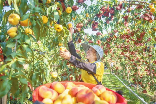 7月15日,娄底市娄星区万宝镇槐柳村智慧果园,果农在采摘蟠桃。近年来,娄星区立足自身优势,积极探索城乡融合、产业融合的乡村振兴发展道路,形成“一村一品”产业格局。