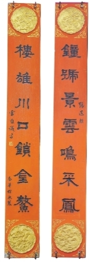 下联“楼雄川口锁金鳌”——楼阁雄峙川口,神鳌镇守山河。