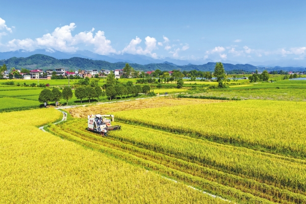 8月31日,东安县紫溪市镇塘复村,农民驾驶收割机收割中稻。时下各地中稻陆续成熟,农民抢抓晴好天气收割中稻,确保颗粒归仓。
