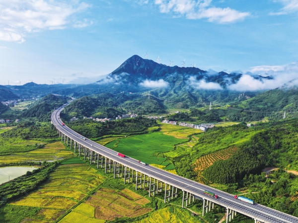 8月31日,常宁市泉井村,青山翠绿,云雾缥缈,山顶的风电机组若隐若现,穿行而过的高速公路与田园、民居相互映衬,构成了一幅生态优美的乡村田园画卷。