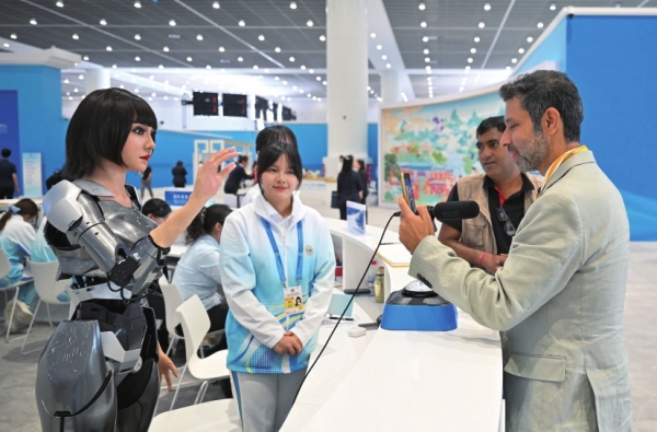 8月30日,上海合作组织峰会志愿者在新闻中心引导媒体记者与多模态交互型机器人“小合”对话交流。