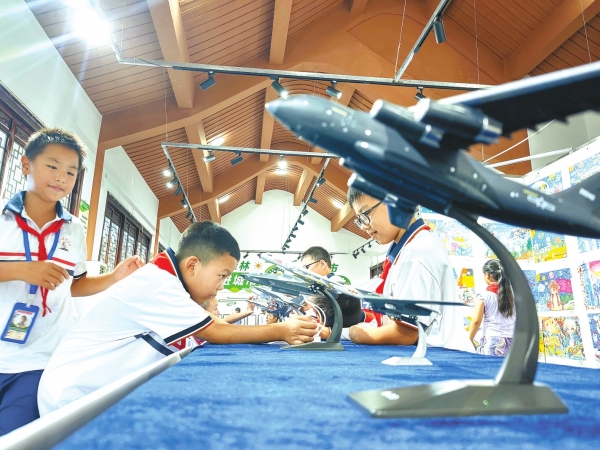 9月3日,蓝山县植物园科普宣教馆,学生在参观航空模型。连日来,该县结合开展全国科普月活动,举办湘江源科普展,引导青少年通过现场观摩和体验,增长科学知识,探索科技奥秘。