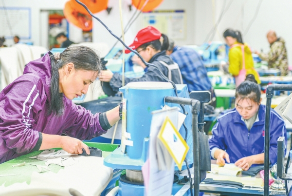 11月4日,道县高新技术产业开发区永州创优运动用品有限公司,工人在运动鞋生产线上作业。近年来,该县全力保障劳动力充分就业,推动群众持续增收。