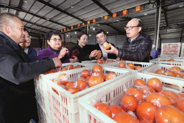 12月19日,溆浦县大江口镇洑水湾村,周秀芳(左三)在岩橙仓储了解销售情况。当天,该村迎来了一位特殊的“新农人”——全国道德模范、全国脱贫攻坚先进个人、“支教奶奶”周秀芳。今年78岁的周秀芳,从浙江宁波退休后,辗转贵州、湖南、四川、新疆、吉林等地山区支教多年,牵头捐建30所希望小学,带动爱心人士捐赠款物3500余万元,帮扶贫困学生2000多名。如今她又将爱心从教育帮扶延伸到产业振兴,聚焦村集体经济发展,助力优质岩橙走出大山。