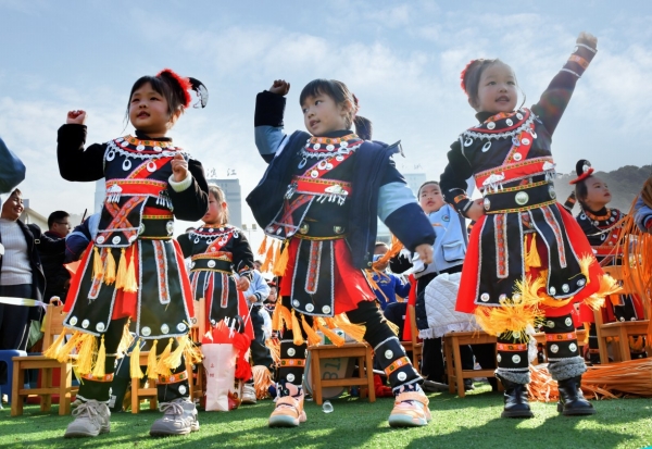 12月19日,吉首市第四幼儿园,萌娃在表演节目。当天,该园举行“鼓舞童心,情润湘西”第二届鼓文化节,萌娃们通过“鼓风鼓韵”等特色活动体验非遗魅力,在趣味互动中传承优秀民族文化。