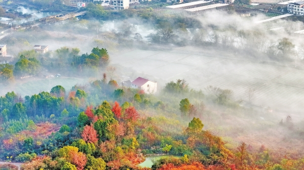 12月26日清晨,常宁市曲潭街道办事处义田村,朝霞中的田园村落与多彩树林、清清河流相映成趣,在晨雾笼罩下宛如一幅水墨丹青。