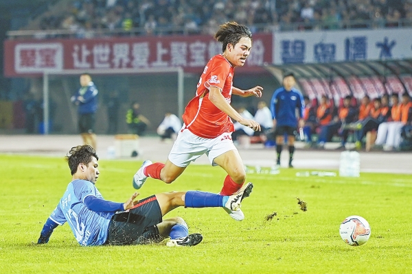 10月17日晚,湘潭市体育中心,湘潭队(红)和株洲队球员在比赛中奋力拼抢。当天,湘潭队主场1比1战平株洲队。 |