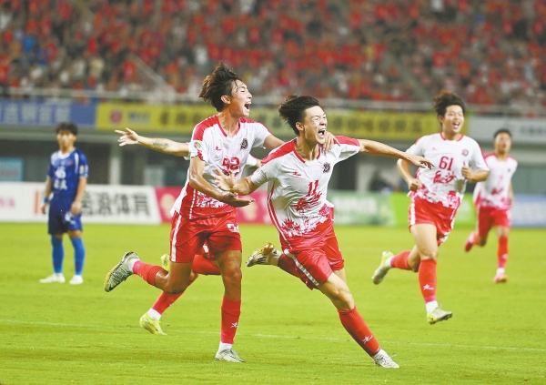9月7日晚,长沙贺龙体育场,长沙队李章毓(右)进球后庆祝。该球为湘超联赛首个进球。当天,2025湖南省足球联赛揭幕战打响,长沙队2比0力克娄底队。 |