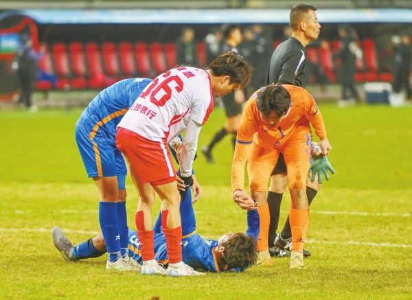 12月14日晚,长沙贺龙体育场,长沙队球员(白)在比赛结束后安慰岳阳队球员。 |