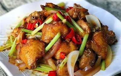 7.加入芹菜炒出香味,倒入炸好的鸡翅炒匀。