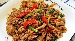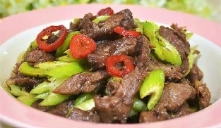材料:牛肉约75克、西芹4大瓣、孜然粉1小勺、苏打粉1/4小勺、胡椒粉1/3小勺、玉米淀粉1小勺、菜油1大勺、蒜头2瓣、孜然籽碎1/2大勺、红椒1条、辣椒粉1小勺、精盐1/3小勺、生抽1大勺、胡椒粉1/3小勺、白糖1/3小勺、白酒1大勺
