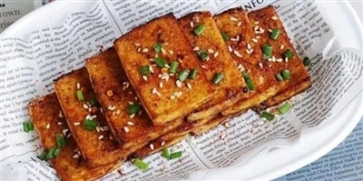 材料:豆腐1块、熟白芝麻少许、葱少许、生抽6克、老抽6克、孜然粉5克、辣椒粉3克、蜂蜜5克、盐3克、椒盐2克