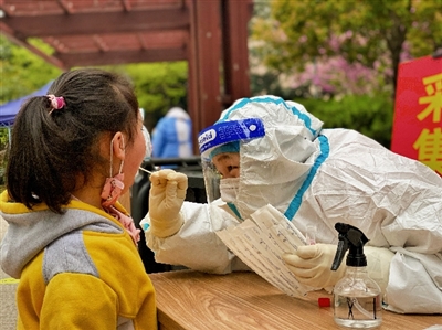 为切实做好疫情防控工作、有效阻断疫情传播,3月20曰上午8时至晚上9时,长沙市岳麓区西湖街道启动全员核◇◇测工作。图为核◇采样点医护人员正在为一名儿童进行核◇◇测。