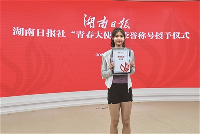 9月8日,夏思凝被授予湖南日报社“青春大使”荣誉称号。夏思凝2003年出生于湖南邵阳,中国女子100米跨栏运动员,2023年全国田径锦标赛女子100米栏冠军。 张京明 摄影报道