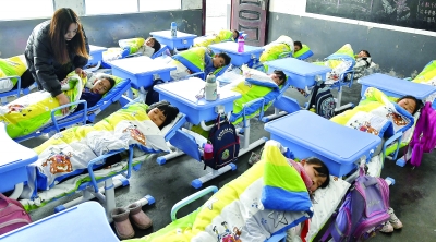 新年伊始,浏阳市龙伏镇黄桥完全小学投入使用一批可躺式课桌椅,展开后可变成“午睡床”,学生由“趴着睡”改为“躺着睡”。图为1月12日,一年级学生使用可躺式课桌椅午休。 童迪 摄影报道