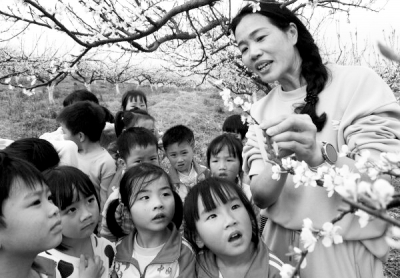 3月16日,嘉禾县塘村镇高峰村农业种植基地,金豆豆幼儿园的老师给小朋友介绍蜂糖李生长知识。花开三月,春意盎然,当地不少学校开展研学实践活动,让孩子们走进果园、菜园、花园,学习农业科技知识,体验劳动带来的乐趣。