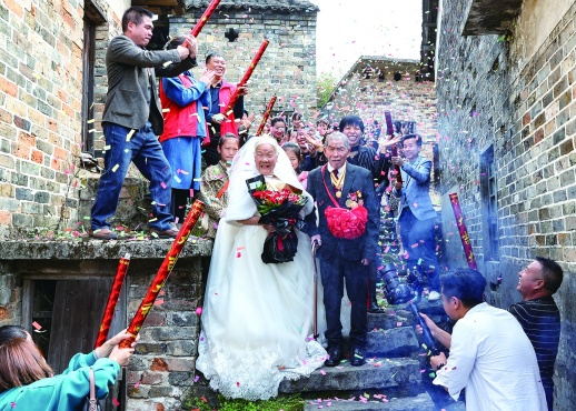2月23日,郴州市临武县麦市乡高峰村举行了一场特别的婚礼,97岁的抗美援朝老兵郭周祥和86岁的老伴郭周周身着礼服、婚纱,在亲朋好友的簇拥下拍下了人生中第一张婚纱照。 通讯员 陈卫平 摄