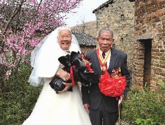 本报2月24日讯 2月23日,郴州市临武县麦市乡高峰村举行了一场特别的婚礼,97岁的抗美援朝老兵郭周祥和86岁的老伴郭周周,身着礼服、婚纱,在亲朋好友的簇拥下拍下了人生中第一张婚纱照。
