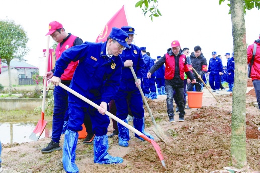 3月2日,“重走雷锋路,共植消防林”学雷锋义务植树活动在长沙市望城区团山湖村举行,150名消防指战员与学雷锋志愿者参与活动。挥锄、铲土、扶苗、培土、填压、踩实,提水浇灌,他们在团山湖村石牛塘组义务植树点爱民渠植下200余株乔木、灌木。