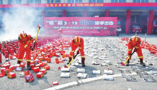 3月15日,省消防救援总队联合郴州市消防救援支队、郴州市市场监督管理局,举行了“质”敬3·15火焰蓝重拳出击——集中销毁假冒伪劣消防产品线上直播活动,200万名网友在线观看。此次集中销毁活动,共销毁了今年执法活动中查获收缴的假冒伪劣灭火器、消防水带、防毒面罩、应急照明灯、感烟报警器等1000余件。