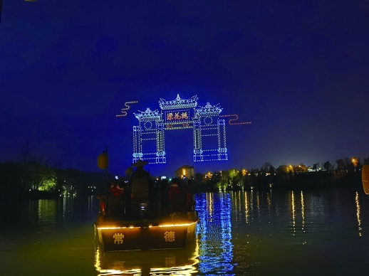 晚上,当夜幕降临时,2000架无人机依次升空,在天空中以毛笔笔迹书写出举世闻名的《桃花源记》。据介绍,这次2000架无人机飞行打破了湖南史上无人机编队飞行架数最多的纪录,也拼出了全球迄今为止最大的空中桃花图案。当晚,游客们还置身秦溪河流剧场观看了大型山水实景演出《桃花源记》。(扫报眉二维码看现场视频)