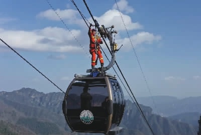 连日来,在张家界市武陵源区天子山景区,当地消防救援、景区管理等多个部门组织开展索道高空模拟救援演练,检验索道安全性能和各项应急救援措施,提高旅游安全应急救援能力,为即将到来的清明假期旅游高峰做准备。不少游客在观看演练时感叹:光看着就腿软。(扫报眉二维码看视频)