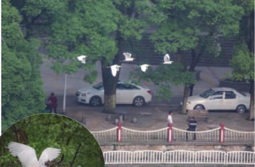 这段时间,住院疗养的退休干部李阿姨就喜欢到医院门诊5楼窗口。她告诉记者,虽然医院随处能听到白鹭的鸣叫,也常能见到它们在水面盘旋、高空飞行,但在这,幸运的话,还能见到鹭鸟衔枝筑巢的场景呢!