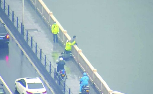 14日上午10时5分,岳麓交警大队分控中心接到110指令,橘子洲大桥西南侧护栏上有一年轻人准备跳桥,立即前往处置。