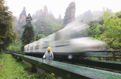 4月24日,张家界国家森林公园十里画廊观光电车工作人员冒雨对电车钢轨、电气设施等进行安全检查。针对强降雨天气,该景区组织各旅游企业加大对特种旅游服务设施的安全检查力度,全力保障雨季汛期接待安全,迎接“五一”旅游高峰的到来。