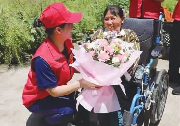 “今年,你们是第三次来我这里了,看到你们的到来,我就像见到了亲人。” 黄妹英一边接过服务队员送上的康乃馨,一边感动地说。
