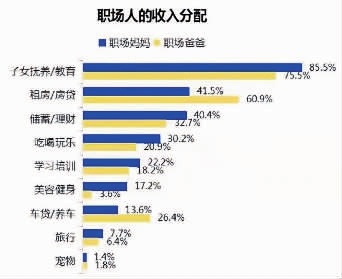 由于职场妈妈较未婚、已婚已育女性普遍更为年长,拥有更多职场经验,相应的收入水平也更高,平均月薪为8534元/月。然而,与职场爸爸12477元/月的薪酬水平相比低了31.6%,而2021年男女职场人平均薪酬差距为12.8%,呈现出婚育加剧家庭中男女双方经济落差的情况。在消费偏好上,85.5%的职场妈妈都将收入主要用于子女抚养和教育。