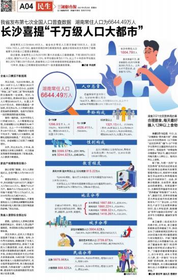 湖南常住人口为6644.49万人,省会长沙常住人口首次突破1000万人,达到1004.79万人。5月19日,省政府新闻办举行新闻发布会,省统计局局长刘文杰发布了湖南省第七次全国人口普查主要数据。