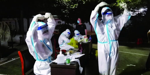 本报7月30日讯 为了让大家安心排队等候检测,社区工作者唱起《相亲相爱一家人》《感恩的心》;市民想方设法为医务人员降温;核酸检测后,医务人员和市民互相比心,加油鼓劲……