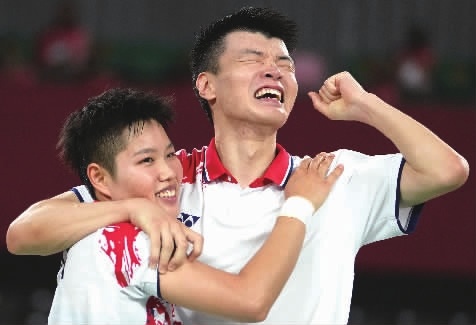 手臂搭在彼此肩上,王懿律右手握拳,黄东萍左手比出第一的手势。30日,他们赢下一场硬仗,在东京奥运会羽毛球混双决赛中2:1战胜队友郑思维/黄雅琼,收获金牌。