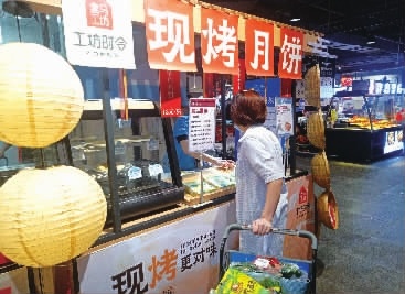 “刚出炉的现烤月饼,小心烫啊!”8月8日,在盒马鲜生喜盈门店内的月饼销售区,小龙虾鲜肉、榴莲、流心奶黄、芥末三文鱼等6款现烤月饼在控温箱内依次排开,卖相颇为诱人,吸引不少刚进店的消费者驻足试吃。