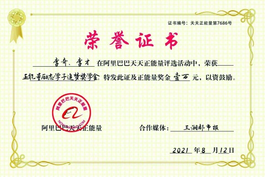 8月12日,三湘都市报联合阿里巴巴天天正能量,为李奇、李才姐妹颁发了一万元正能量励志学子追梦奖学金,并授予她们“阿里巴巴正能量校园大使”称号。
