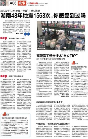 据湖南省地震台测定:8月15日23时12分59秒在湖南邵阳市邵东市(东经111.64度,北纬27.31度)发生2.1级地震,震源深度8公里。有当地网友表示,床摇了几秒,是不是出现幻觉了?也有网友表示没啥感觉,“看了微博才知道地震了”。这次地震震级不大,但在湖南人的朋友圈里却引起了不小的“余震”:“湖南怎么也有地震?”“有生之年系列吧”……8月18日,记者就此采访了省地震局专家。