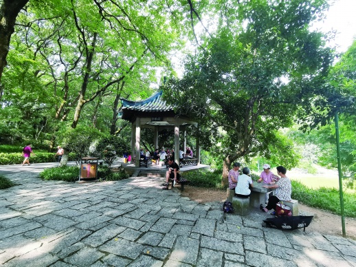 爱乐亭附近,二十多位老年人分为几桌,或坐在亭子里或坐在树荫下闲聊、玩牌,大家交谈时,都自觉地降低了分贝。