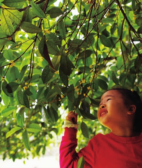 10月8日,寒露节气,长沙市望月公园,小朋友在欣赏盛开的桂花。近日,该园主游道两侧的部分桂花树已开花,香气袭人。据悉,未来一周冷空气活动频繁,湖南离秋天也不会太远了,比往年推迟了20天开放的桂花也将迎来盛花期。