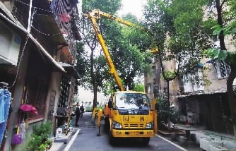 “整个小区里大概有210棵树木,从10月1日开始进行作业。那种树枝太茂盛,长到居民家阳台或者窗户边上影响家中采光的就会进行修剪,发现枯死的树就会砍掉。”现场,园林工作人员王雄告诉记者,因为社区的楼与楼之间间距窄,很多房屋前的树,没法进吊车,所以他们只能爬到树上修理。