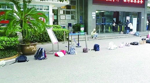 上午8时许,距离湖南省图书馆开馆还有半个小时,门外却早已排起了长队。比较特别的是今日排起长队的不再是人群,而是书包。长长的队伍里整齐地摆放着各种各样的书包,偶有几个人陆陆续续前来,也自觉地站到了书包队伍的后面。