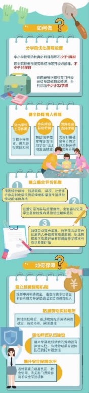 《实施意见》明确了省、市、县三级一体统筹,强化组织实施。要求各地党委政府把劳动教育摆上重要议事日程,建立健全实施劳动教育的长效机制,实行分级负责、层层落实,及时发现和解决劳动教育中存在的问题。