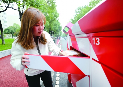 11月2日,大学生在无人驾驶快递车上领取快递。近日,物流公司把无人驾驶快递车开进南华大学,循环行驶在校园内,取件人可以全程人机交付,无接触方式带来了更安全、放心的快递服务。