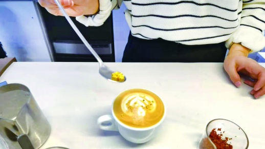 11月4日,长沙市开福区一家咖啡馆的主人佘敏在调制“桂花拿铁”饮品,浅琥珀色的糖里混着星星点点的金色桂花,清香扑鼻。佘敏介绍,他们的桂花糖用的是金桂,制作时要经过筛、挑、洗、榨、伴、酿等六道工序。除了烘培和饮品,桂花的香味还能出现在美味菜肴中。