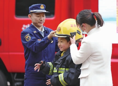 11月9日,学生在消防员的帮助下体验佩戴消防头盔。当天是全国消防日,资兴市消防救援大队将消防宣传车开进消防文化主题公园,为市民打造学习消防知识的“流动课堂”。