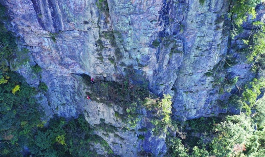 11月10日,张家界市武陵源山地应急救援队队员在黄石寨悬崖绝壁上捡拾丢弃的塑料袋、饮料瓶等垃圾,用实际行动呼吁广大游客呵护武陵源世界自然遗产,保护自然生态环境。吴勇兵 摄