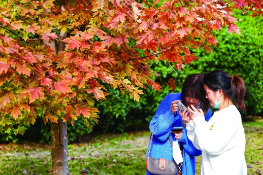 11月11日下午,在湖南农业大学第九教学楼南侧,百余米的路两旁,火红的北美红枫吸引了不少学生和附近居民前来拍照。三湘都市报记者注意到,虽然第九教学楼南侧的北美红枫大多已变红,但细看却能发现,一些较高、较粗壮的枫树上,从树顶往下竟依次出现了红、橙、黄、绿不同颜色的枫叶。湖南农大绿化中心副主任解再明介绍,2010年至今,湖南农大陆续引进了300株不同品种的北美红枫,分别种植于学校西大门、第九教学楼、第八教学楼、图书馆附近,因品种不同,校内种植的枫树枫叶变红的时间也有所差别。“差不多每年都是第九教学楼南侧和西门的枫树先红起来,等到12月上旬,图书馆北侧的枫树也会进入观赏期。”至于为何同一棵枫树会出现红叶与绿叶共存的现象,解再明说,这是受光照影响,光照充足的树顶枫叶往往也会先变红,且颜色较浓。作为原产于美国北部和加拿大地区的寒带植物,北美红枫的秋叶景观受气候与土壤等环境因素的影响较大。湖南地处亚热带湿润地区,湿润的环境并非北美红枫的最佳生长环境,为了保证校内的“枫”景,湖南农大每年都在北美红枫的养护和病虫害防治问题上投入了不少精力。