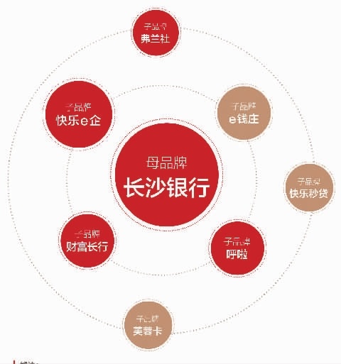 子品牌根据不同的条线划分为零售条线、综合条线、公司条线。子品牌零售条线,包括弗兰社、财富长行、快乐秒贷、芙蓉卡、呼啦这五个子品牌,子品牌综合条线是e钱庄,子品牌公司条线快乐e企,最终形成品牌家族矩阵。